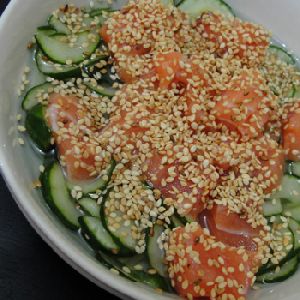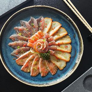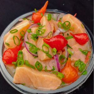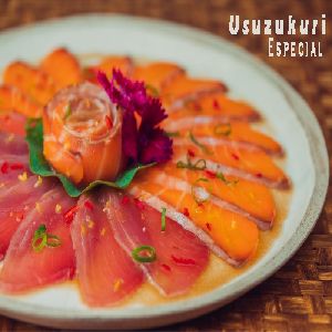 Lâminas de salmão e atum em molho especial, com flor de sal, azeite trufado, cebolinha, pimenta dedo de moça e raspas de limão siciliano com molho cítrico especial da casa.