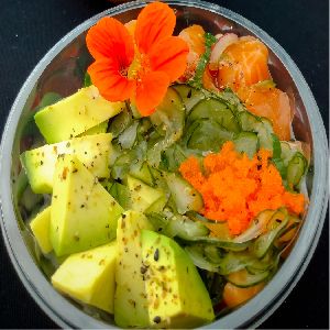 Arroz, salmão temperado, cebola roxa, sunomono, edamame, abacate ou manga, kani, crocante de harumaki e gergelim. INFORMAR PREFERÊNCIA ABACATE OU MANGA