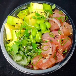 Bowl com arroz, atum temperado em molho especial da casa, cebola roxa, abacate ou manga, sunomono, kani, edmame, crocante de harumaki e gergelim ( cream cheese opcional)