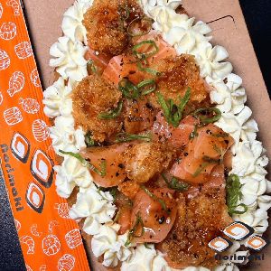 Arroz de sushi empanado e frito, fazendo a casaquinha crocante, generosa camada de cream cheese, cubinhos de salmão, camarões empanados, cebolinha, gergelim e teriaki.