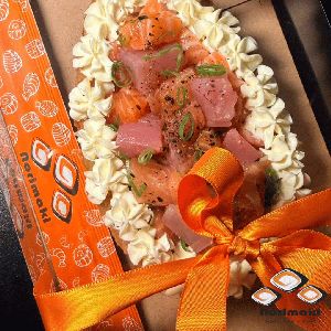 Arroz de sushi empanado e frito, fazendo a casquinha crocante, camada generosa de cream cheese, cubos de salmão e atum, cebolinha, gergelim e teriaki.