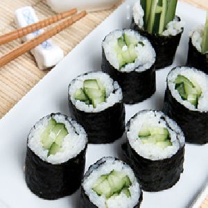 Uramaki com camarões empanados, pepino, gergelim e cebolinha