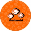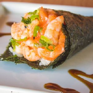 Alga, arroz, camarões empanados e fritos, cream cheese, cebolinha e gergelim em formato de kone.