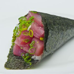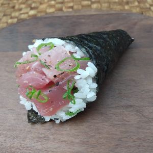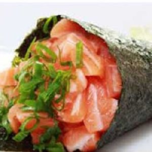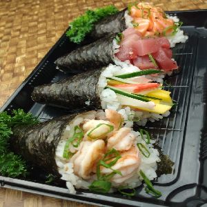 Alga, arroz, salmão, atum. haddock, cebolinha e gergelim em formato de kone.