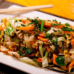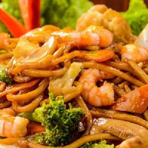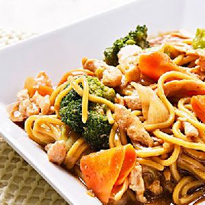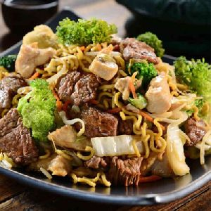 Macarrão para yakissoba, lombo suino, brocolis, repolho verde, cenoura e shoyu em molho especial da casa