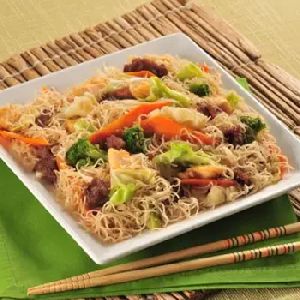 Macarrão de arroz, legumes, frango e filet mignon, em molho especial.